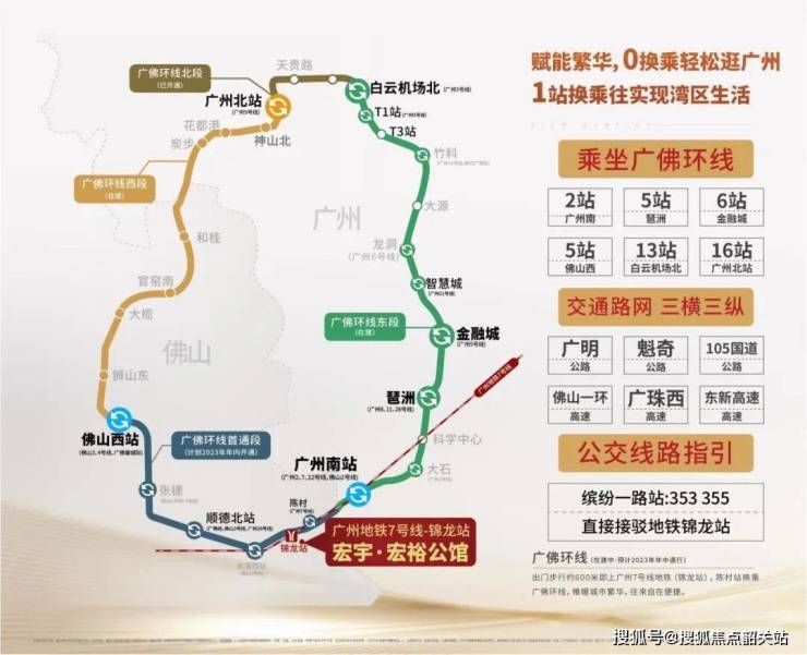 地铁:广州地铁7号西延线锦龙站就在项目旁,步行约500米,约3分钟就能到达地铁口,4站到达广州南站;佛山地铁2号线起始广州南站贯穿整个佛山东西;广州南站1小时快速通达粤港澳城市群,全面对接广深港的科技创新产业和各项资源;